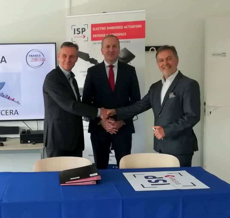 Etienne Poirier, Director of Operations SERMA Ingénierie, and Paul Sauvageot, CEO of ISP System, signed on 21st April 2023 a consortium around the FLYCERA project, selected by the France 2030 program: to produce low-carbon aircraft in France.